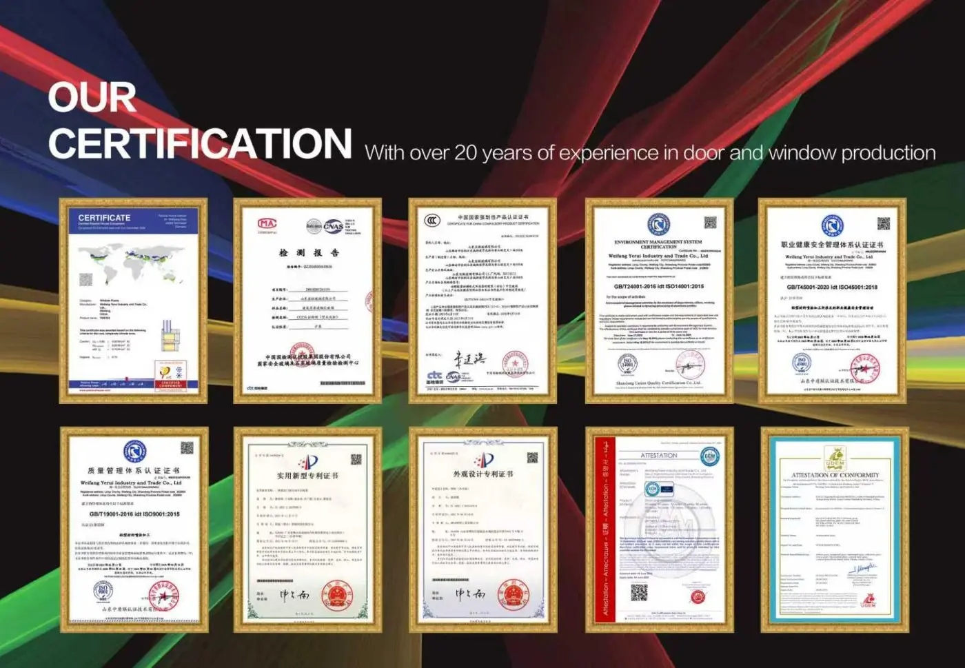 Weifang Yirui Industry and Trade Co., LTD. vyrábí především stavební profily, průmyslové profily, nosné fasádové a dveřní a okenní profily, protipožární skla, tvrzená skla, energeticky úsporná LOW-E izolační skla, vrstvená skla, přesná hranová skla atd., dále vyrábí systémovádveře a okna, skládací dveře a okna, elektrická okna, automatické elektrické dveře, komerční dveře, posuvné dveře, solária, pavilony, hliníkové stojany na květiny, okna v čínském stylu, okna v evropském stylu, stejně jako hliníkové zábradlí askleněné zábradlívhodné pro vnitřní i venkovní použití, které mají dobrou odolnost vůči venkovní korozi a vysoký vnitřní bezpečnostní faktor a všechny produkty lze přizpůsobit podle různých požadavků zákazníků.